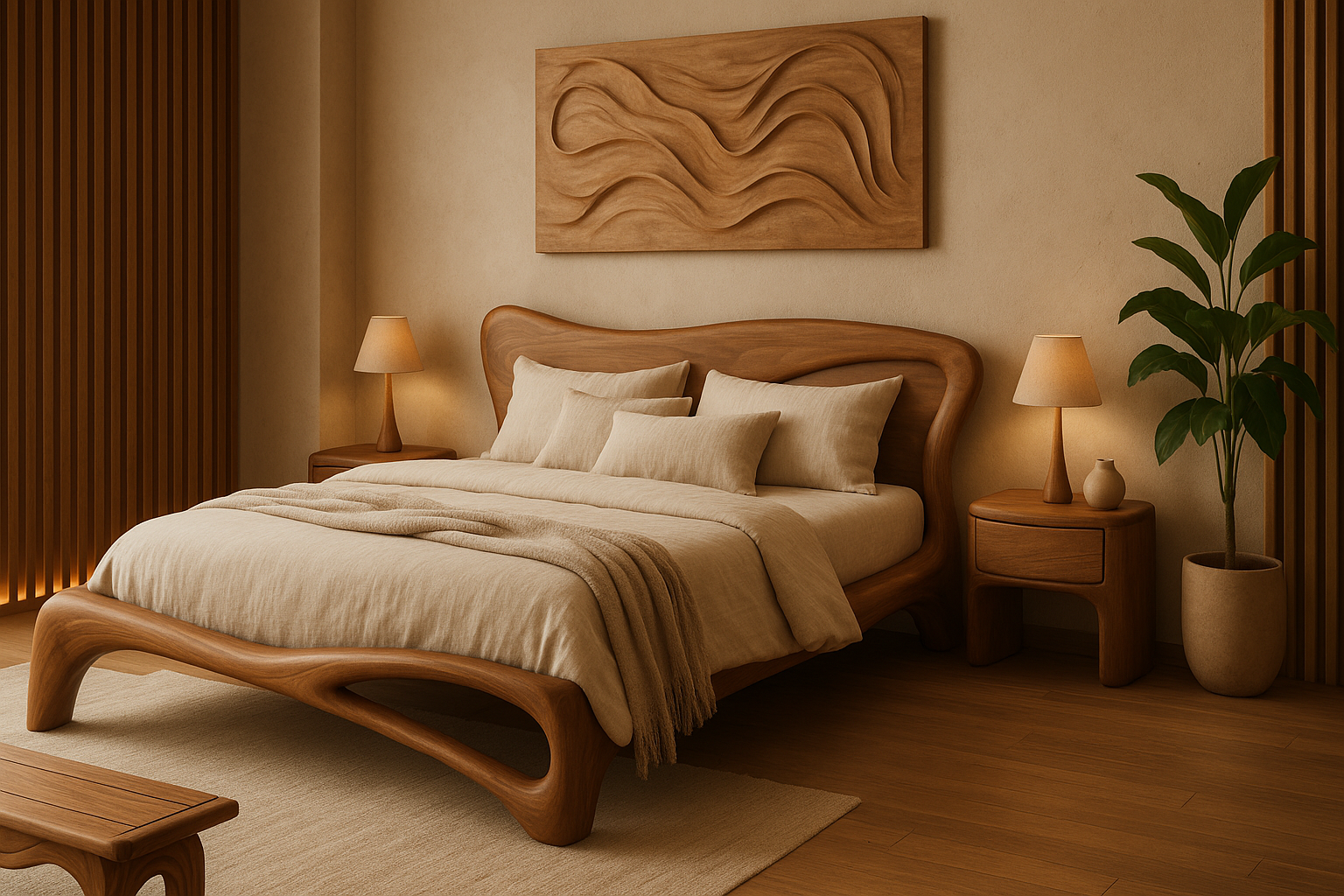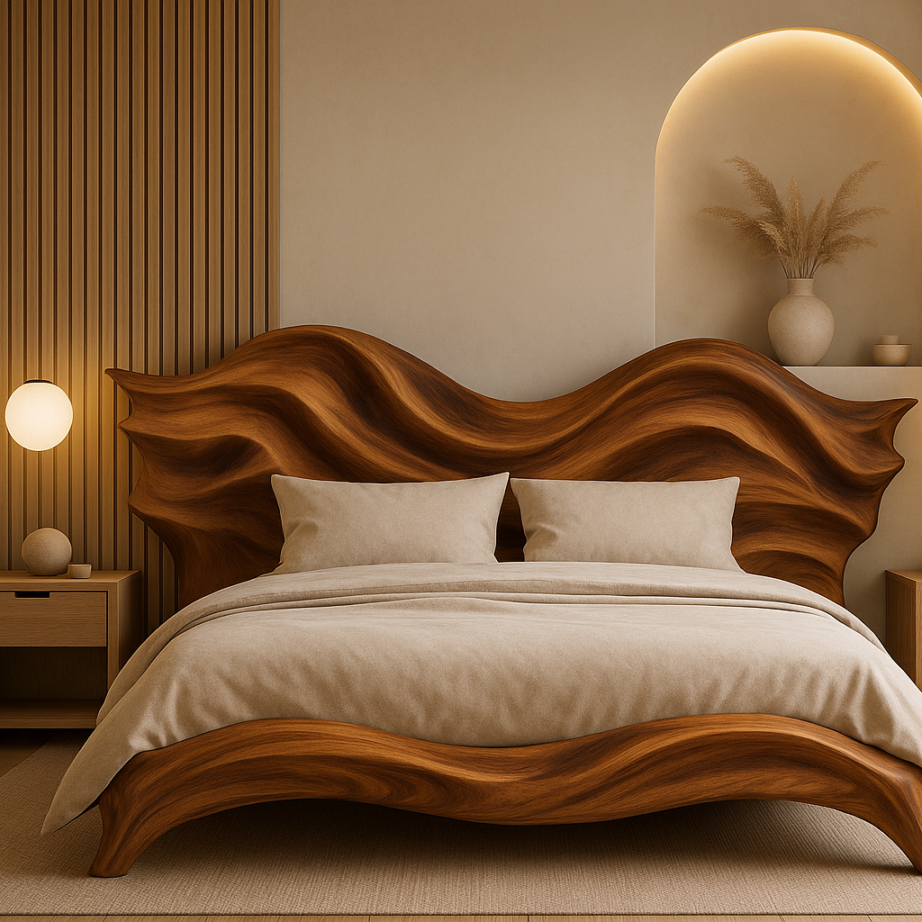 Inspired by the essence of classic craftsmanship, curved wooden beds, carved wooden lamps or bedside tables bring luxury and lasting value. Dark wood tones such as cherry or mahogany add depth and elegance.